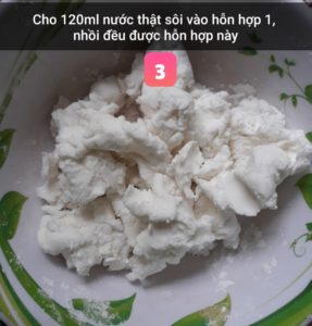 3. pour BOILING water into bowl in no. 1, mix well to reduce hot. Then use hand to knead 1 minute
